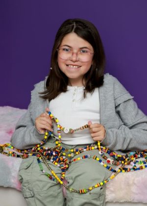 On crafting with her siblings: We make jewelry — earrings, necklaces, bracelets and keychains with charms. We also make sensory bottles, slime and play dough that are different themes. We have beaded pens and pencils, candy cones and hot chocolate reindeer. My brother does wood burning. We are always making new creations to add to our table at craft markets.