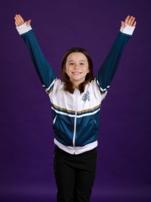 Outside of the gym: I like to paint, draw and sketch. I love playing with my friends at school and bouncing on our trampoline at home. I also really enjoy skiing — we go a lot in the winter — and camping with family friends.