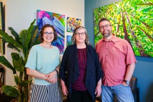 Artist Cindy Zampa, centre, with Shawn and Cheryl Kraft, is thrilled with the gallery. “It’s the first time I’ve contributed my art and I’m truly grateful to you for offering artists this unique platform. I believe art has the power to heal, comfort, inspire and connect — and I admire how you’ve created an environment that nurtures both your clients and the local creative community. It’s a gift to have my work exhibited publicly, where it can bring a sense of calm or spark a memory for someone walking through the door.” Zampa’s work, Denman Island Sentinels (48” x 60”), is displayed behind them.