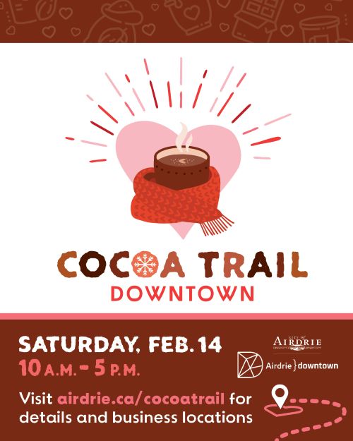 Fall in love with downtown Airdrie on February 14 along the Cocoa Trail! Stroll through downtown to discover pop-up vendors paired with your favourite local business, sweet surprises, and one-of-a-kind finds. Centered around the cozy allure of hot chocolate and infused with Valentine’s Day charm, Cocoa Trail Downtown invites the community to discover unique matches and fall in love with local businesses. Celebrate the season of love by shopping local, sipping hot cocoa, and supporting your community.