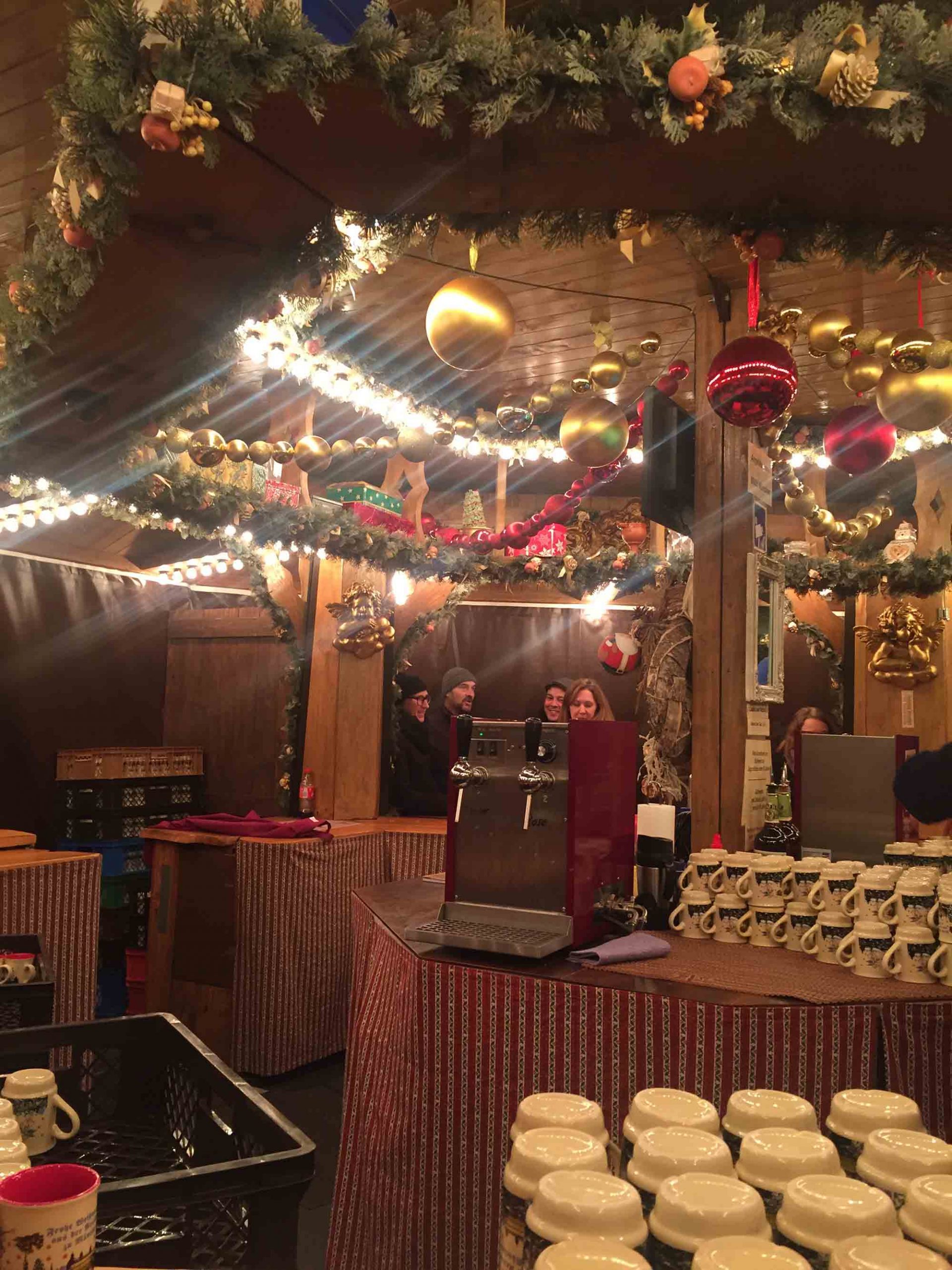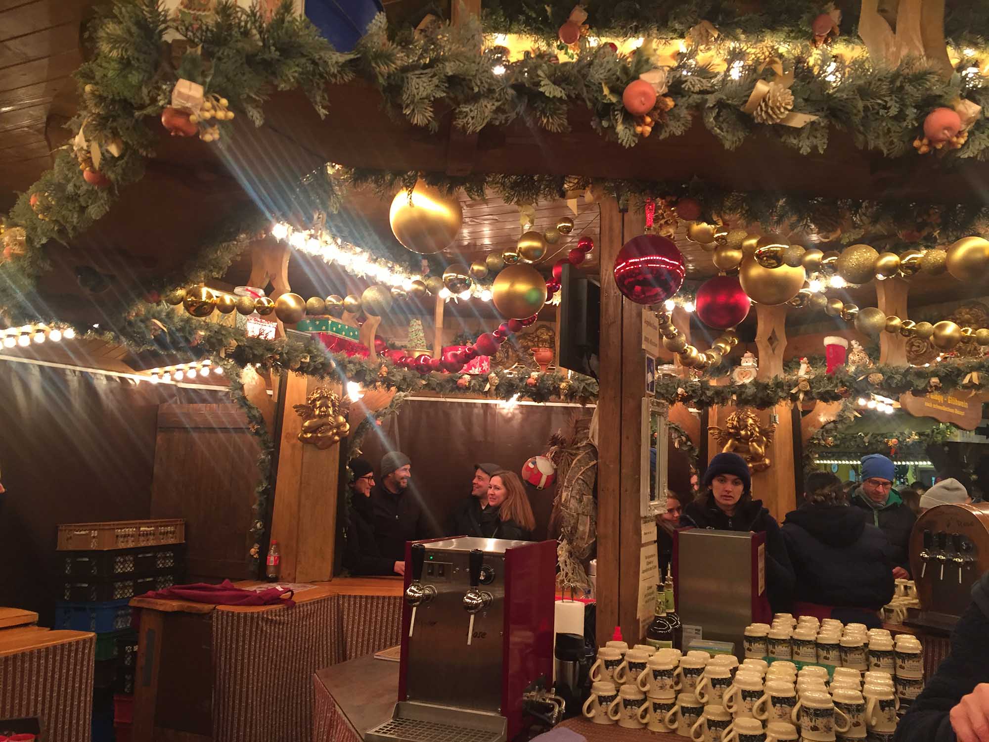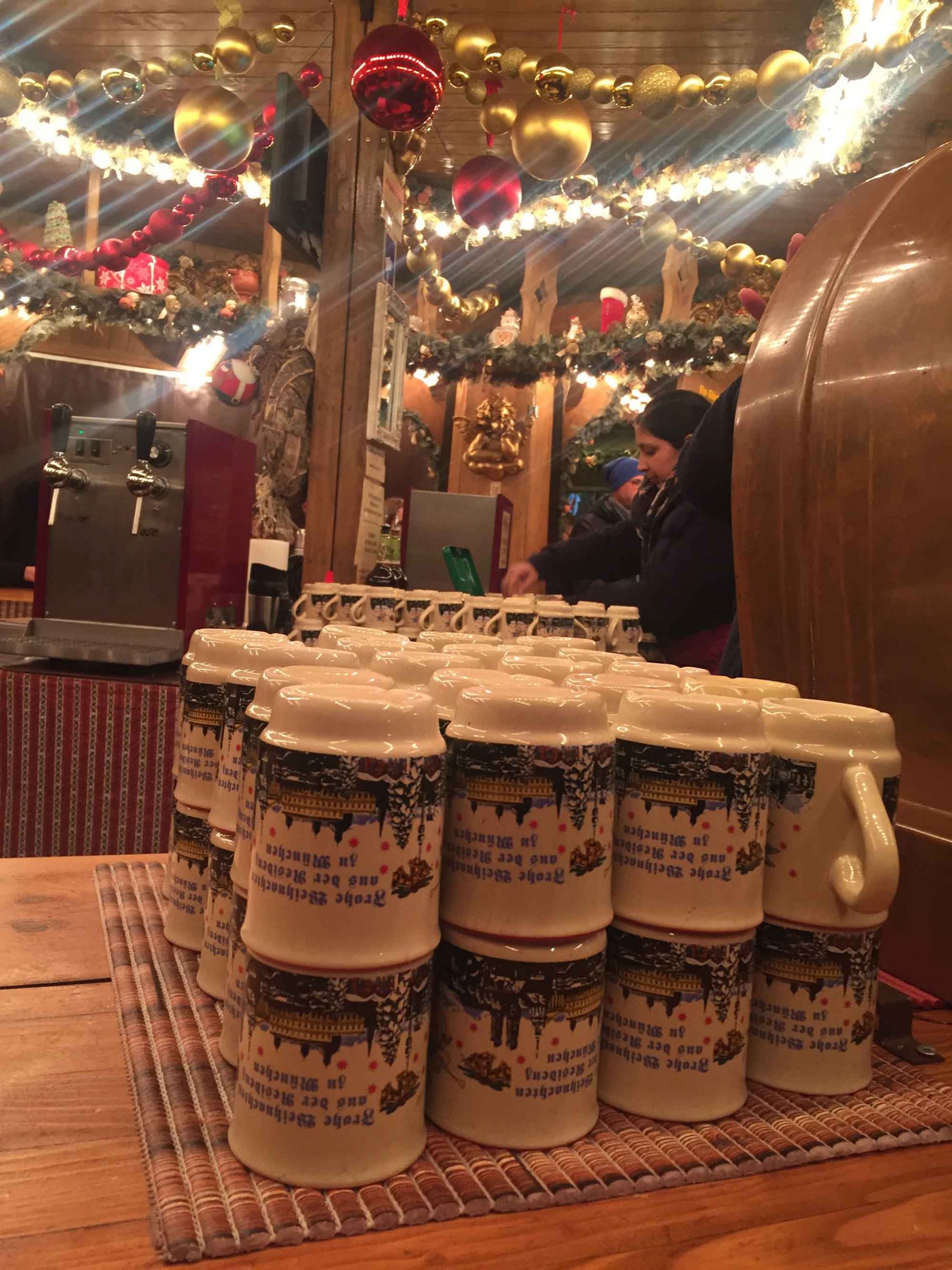If you ever happen to be at a German Weihnachtsmarkt, here are some things you need to try: Feuerzagenbowle (mulled wine with a rum-soaked sugar cube set on fire), Glühwein (traditional mulled wine and you can keep the mug as a souvenir for a small price), German wursts in bun, roasted and candied nut, waffles, chocolate-covered fruit, and chimney cakes.