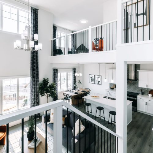 The Mission is a great starter-style family home with a new, and unique, optional kitchen layout that actually is based around the idea of the “kitchen party.” In particular there is a large island with no kitchen table, along with openconcept shelving cabinetry, an expansive living room area, and an open staircase leading upstairs. The upper floor hosts a quaint bonus room, upper-floor laundry, two bedrooms plus master bedroom and ensuite area. This home is very sleek and modern in style with emphasis on the contrasts of white on black.