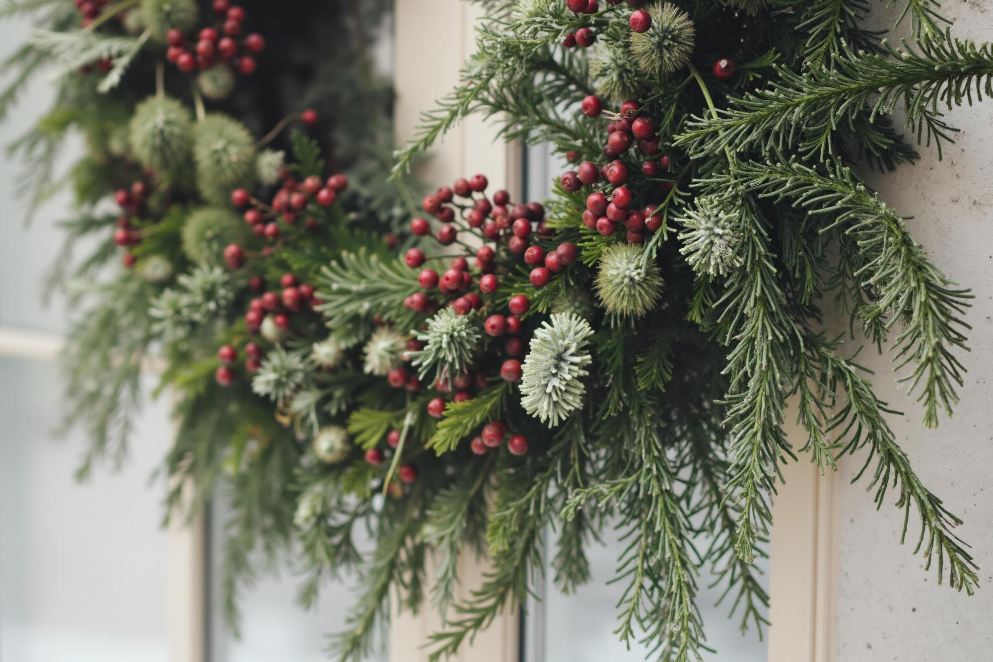 Begin with fresh greenery such as cedar, pine and fir, which hold their colour and scent beautifully. Mix in pine cones, red berries or curly willow branches for texture and contrast. A wide ribbon in rich tones of gold, red or deep green adds the perfect finishing touch.