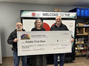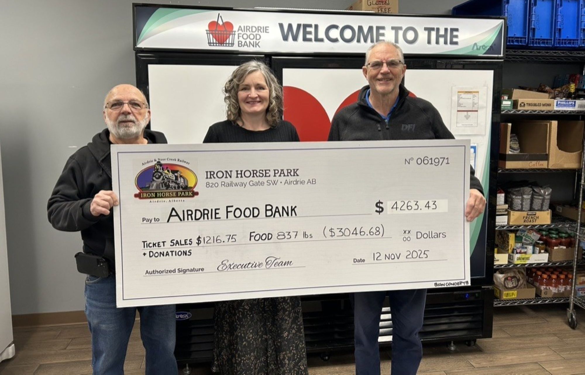 Pictured above are two Iron Horse Park members presenting a cheque to the Airdrie Food Bank. This represents the contributions in both cash from train trip ticket sales as well as weight of food donated on the Annual Halloween run fundraiser event. We counted 903 riders that day. The actual ticket sale and cash donation was $1,216.75.