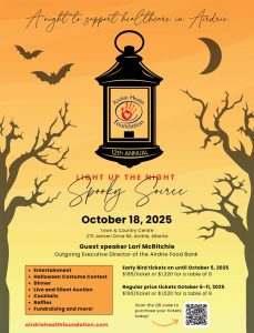 Join for a frightfully fabulous evening at Airdrie Health Foundation’s 12th annual Light Up the Night Gala – Spooky Soirée. Dress to impress (and distress!) for a night of eerie elegance, live entertainment, and community spirit. Lori McRitchie, outgoing Executive Director of the Airdrie Food Bank will speak at the event. There will be raffles and prizes for the best costume and more! Get your early bird tickets now. Learn more at airdriehealthfoundation.com.