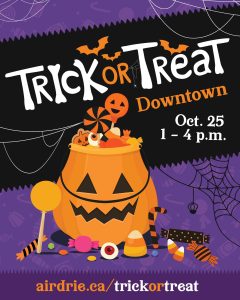 Take a trick-or-treating stroll throughout Downtown Airdrie in costume and fill your bags with goodies. It will be a spooktacular outing to visit all the participating businesses for treats (and tricks). Each participating business will have a “Trick or Treat Here” poster displayed in their window. It will be a haunting scavenger hunt to find all the businesses as an experience in downtown Airdrie. There will be no street closures for this family-friendly free event, so please use caution and be safe. Learn more at airdrie.ca.