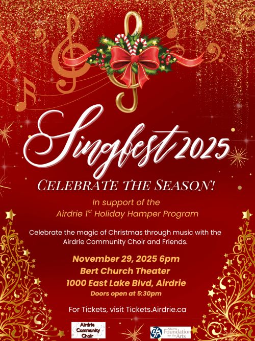 Bert Church Live Theatre 1000 E Lake Blvd SE, Airdrie, Alberta, CanadaA community performance hosted by the Airdrie Community Choir. Doors open at 5:30 p.m. Show begins at 6:00 p.m. Proceeds support the Airdrie 1st Holiday Hamper Program.