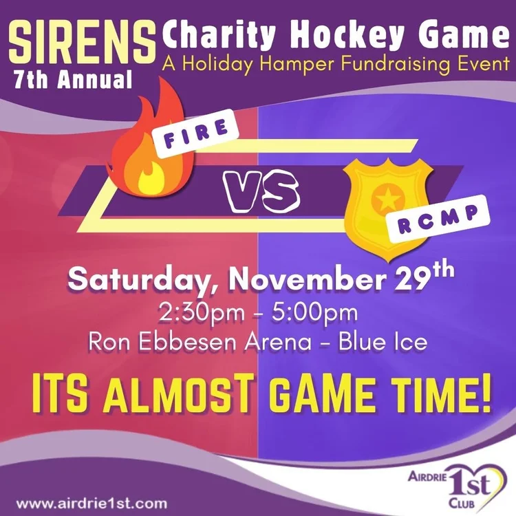 It’s Game Time, Airdrie! The Airdrie 1st Club is excited to host our Annual Sirens Hockey Game! Come cheer on our local Airdrie Firefighter and Local RCMP as they hit the ice for a fun and friendly match — all in support of families in our community. Admission is by donation!We’re collecting family games, kids’ toys, teen gifts, adult gifts, gift cards, or monetary donations to support the Holiday Hamper Program and help bring joy to local families this season.